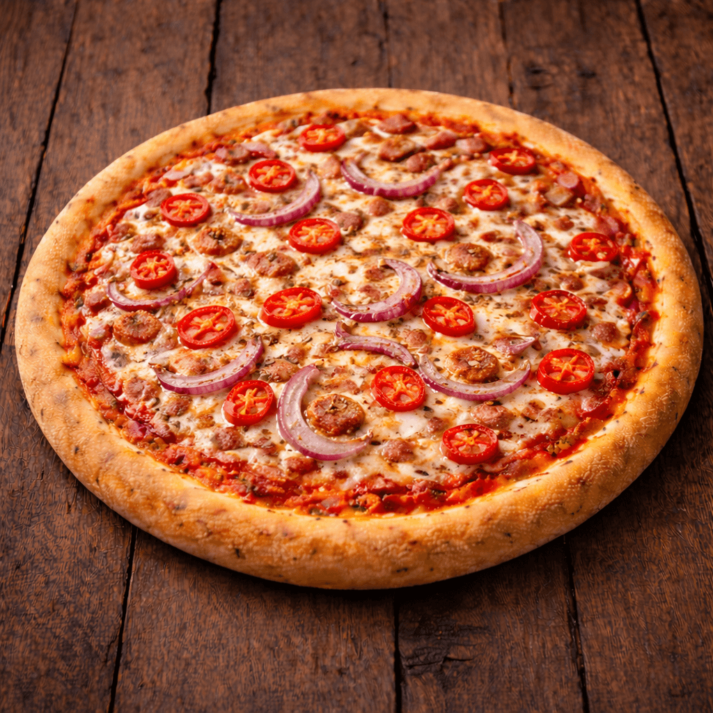Tomate, fromage, oignons, poivrons, olives, merguez, oeuf