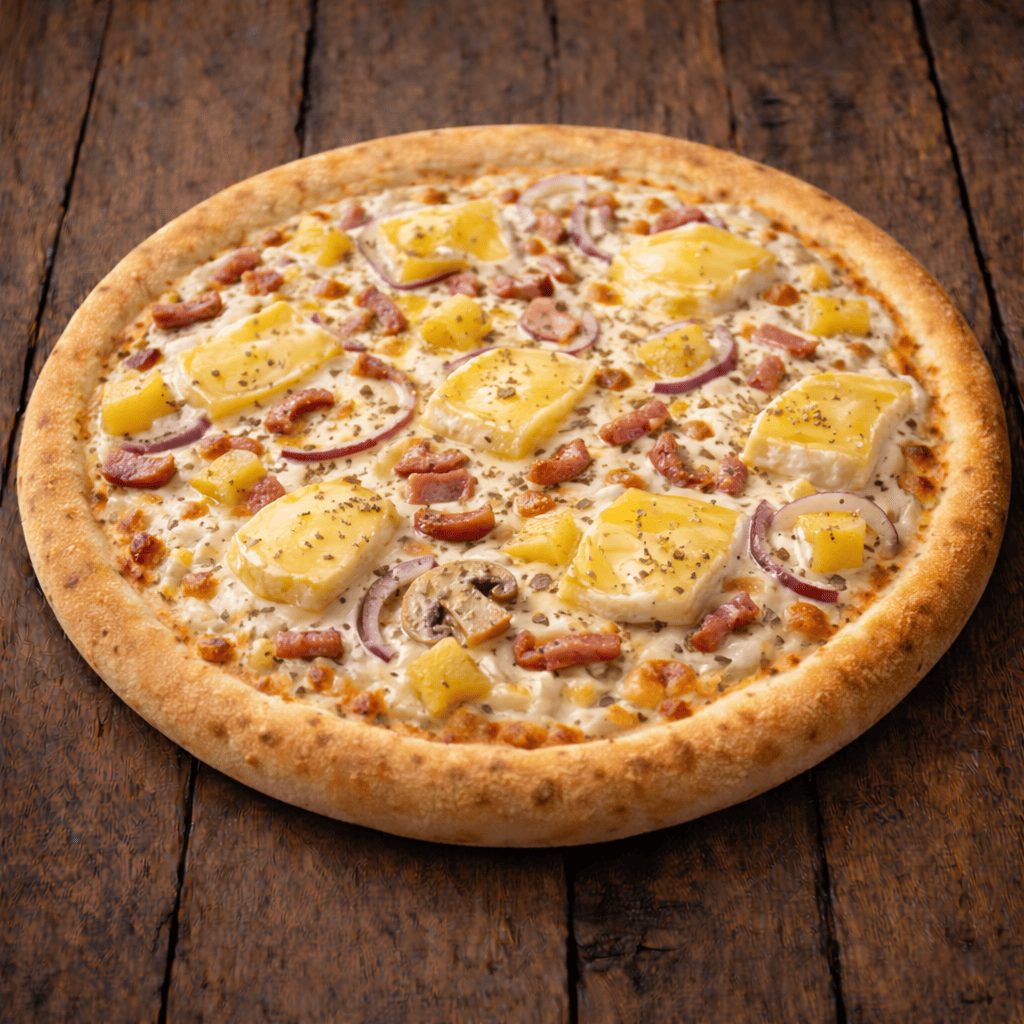 Crème fraîches, fromage, tomate, lamelles de kebab, oignons, tomates